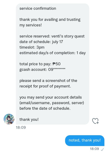 - after my service on your account, i will be posting few screenshots to include in my proof of transactions, personal information such as in-game nickname and uid will be cropped/covered.by availing my service, you agree to the terms and conditions above.sample service confirmation: